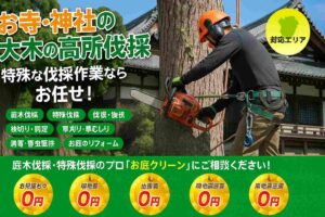 この記事では、そんな大木の伐採作業の実績豊富な「お庭クリーン」の特徴や、安全な伐採のポイントをご紹介します。伐採作業の危険性や費用の目安、重機が必要になるケースなど、木の幹が1m超えの伐採に関する重要な情報をお伝えします。また、住宅密集地や神社仏閣での伐採実績、お客様の声なども紹介しているので、大木の伐採を検討している方に役立つ情報が満載です。「お庭クリーン」が選ばれる理由や、伐採後の処理サービスについても詳しく解説しています。この記事を読めば、木の幹が1m超えの伐採作業を安全に行うために必要な知識が得られ、信頼できる業者選びの参考になるでしょう。